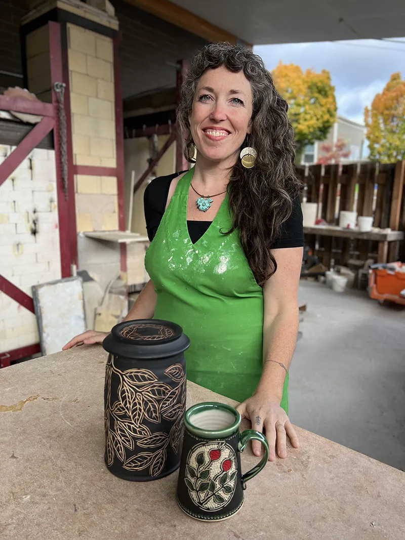 Erica Davidson is a ceramic artist in Bellingham, Washington. She creates handmade ceramic vessels and focuses on surface design that is inspired by the cycles of the natural world, folk tales, block printing, and botany; and enjoys the physicality of translating her inner life into functional vessels.